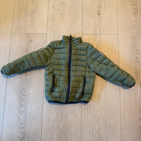 KappAhl jakke for barn i størrelse 110. Jakken er grønn og laget i polyester. Den har glidelåslukking foran og vattert, quiltet design. Armene ka glides av til vest. Superpraktisk og lett jakke. Modellen er unisex og passer både til jenter og gutter. Vask- og stellinstruksjoner står på innvendig merkelapp.