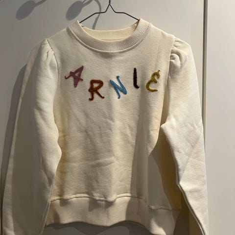 Offwhite farge. Ingen anmerkninger. Genseren er i str M men liten i str så tilsvarer en str S