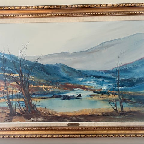Pierre oljemaleri med landskapsmotiv som viser et hus omgitt av trær og natur. Bildet har sterke blå, grønne og jordfargede toner. Maleriet er innrammet i lys treramme med passepartout og smal innerlist. Egner seg som veggdekor i stue, gang eller andre oppholdsrom.