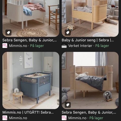Selger en Sebra Baby & Juniorseng. Kan brukes som barneseng for en baby, og forlenges etter hvert som barnet vokser.