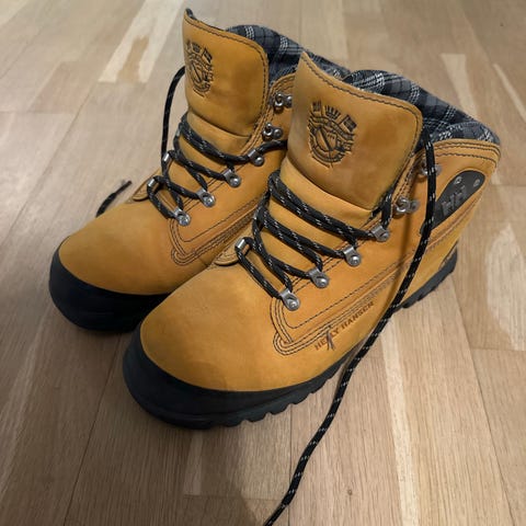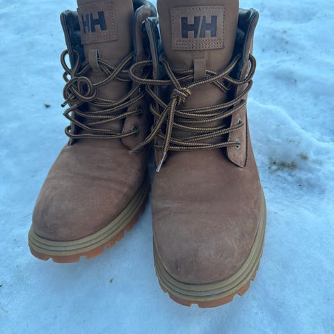 Helly Hansen støvler i størrelse 42. Modellen er ankelhøy med snøring og kraftig yttersåle med grovt mønster. Farge brun/konjakk med lys såle og HH-logo på hæl og tunge. Overdel i skinn- eller nubuck-lignende materiale og polstret kant rundt ankelen for økt komfort. Passer som hverdagsstøvler eller til bruk i kjøligere værforhold.