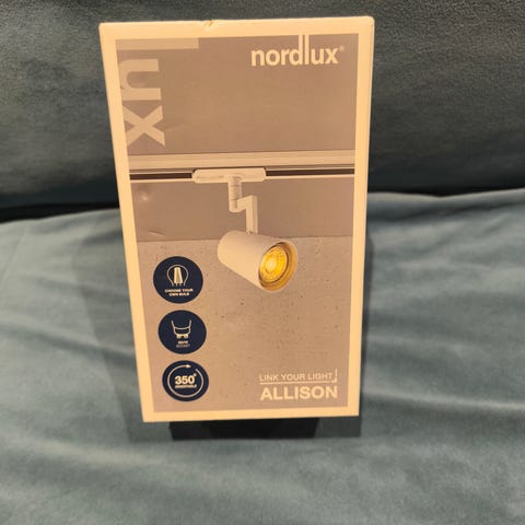 Nordlux Link Rondie spotlampe GU10 hvit. Takmontert spot for bruk i Nordlux Link skinnesystem. Sylindrisk lampehode i hvit utførelse med justerbar vinkel for retningsbestemt belysning. Passer til GU10-lyskilde (ikke inkludert). Egnet til generell belysning eller punktbelysning i for eksempel stue, kjøkken eller gang. Har 6 stk for salg . De ble for store hos oss og raskt byttet til en annen modell. Esken ble kastet .