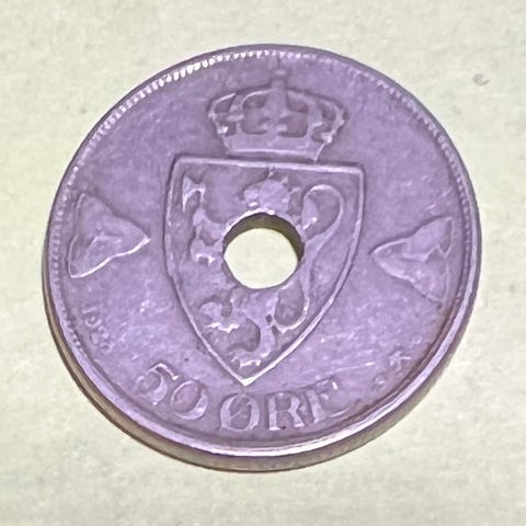 Norge 50 øre mynt med hull fra 1927