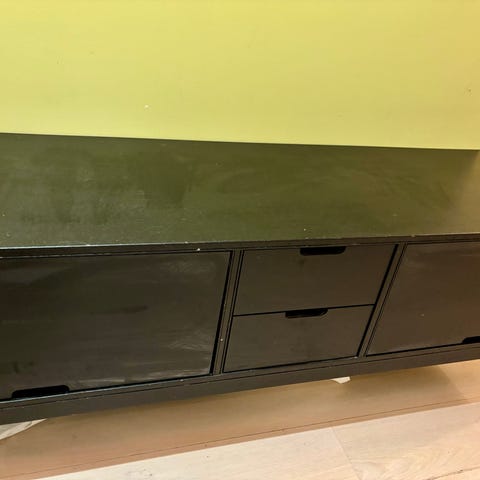 Pent brukt svart/mørkebrun Bestå TV-benk fra IKEA og godt brukt lenestol i bjørkefinér med off-white stolpute.