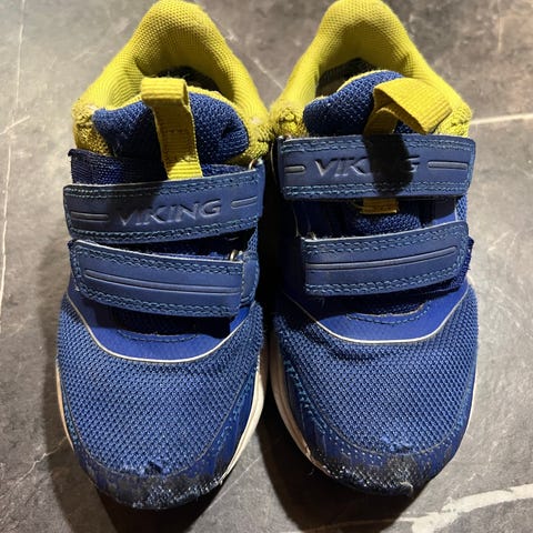 Viking joggesko for barn, unisex, i størrelse 26. Skoene er svarte med lys såle og borrelåslukking. Overdelen er i pustende mesh-materiale med forsterkninger for bedre hold. Passer til hverdagsbruk og lek ute og inne.