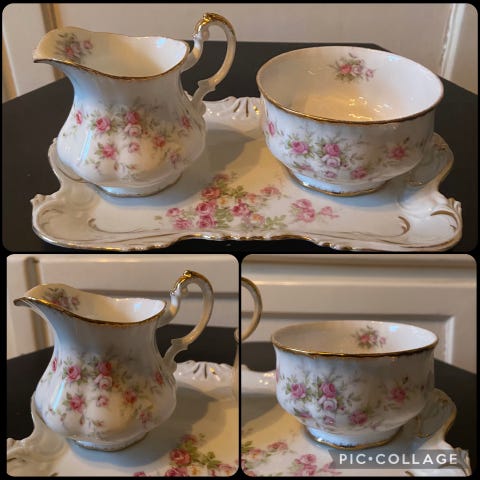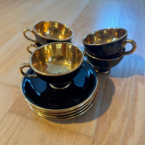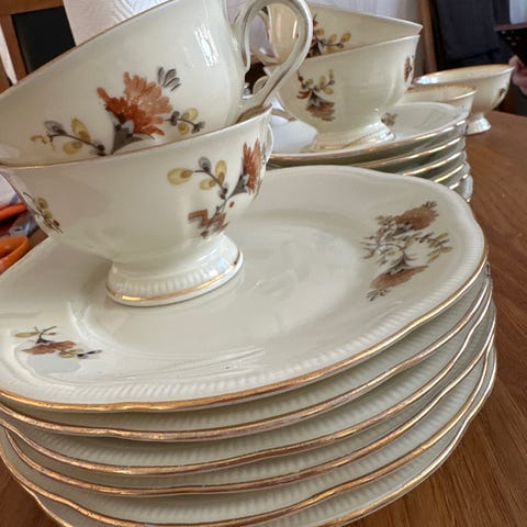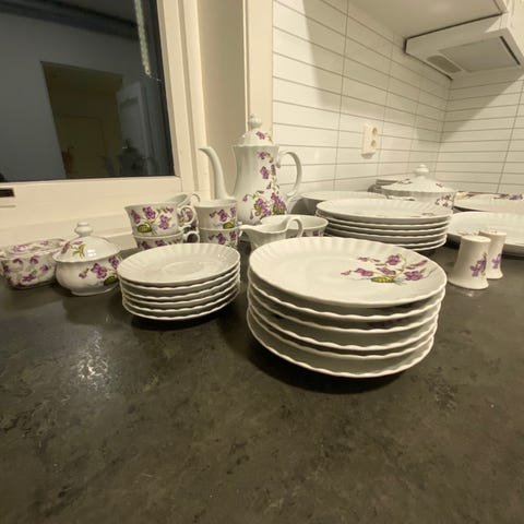 Selger dette kaffeserviset med blomsertdekor.