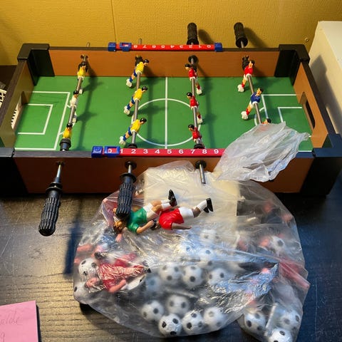 Lite brukt fotballspill gis bort. Har fremdeles begge ballene og alle pinnene er rette og glir godt.