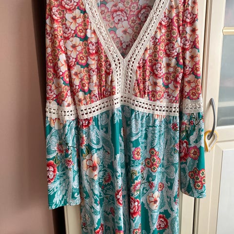 Type: Sommerkjole / bohokjole, Materiale: Lett og behagelig stoff, Farge: Hvit, Størrelse: L, Passform: Ledig og luftig, Design: Knyting bak og dekorativ kant nederst, Stil: Boheme / strand / casual, Bruk: Strand / hverdag / sommer, Tilstand: Kun prøvd