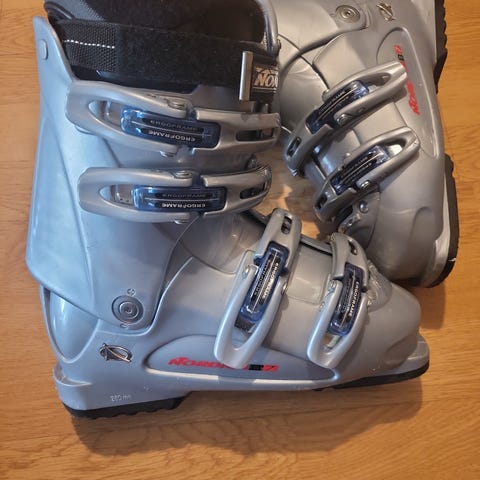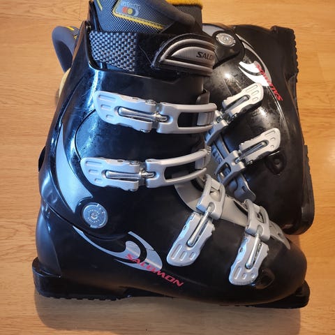 Salomon S9 alpinstøvler str 41.5/42 i svart og grå farge. Støvlene har fire justerbare spenner i metall og powerstrap øverst for bedre tilpasning rundt leggen. Innvendig er det polstret og fôret innerstøvel for økt komfort. Sålen har kraftig mønster for bedre feste ved gange på snø og is. Passer til bruk i alpinbakke med vanlige alpinbindinger.Mondo str 26.5