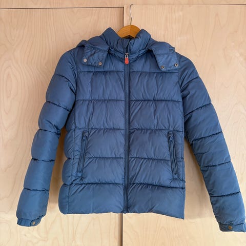Save The Duck dunjakke for barn i størrelse 152. Jakken er svart og laget i polyester med syntetisk Plumtech-fyll. Modellen har hette, glidelåslukking foran og sidelommer med glidelås. Passer som unisex ytterjakke til hverdagsbruk og utendørsaktiviteter i kjøligere vær.