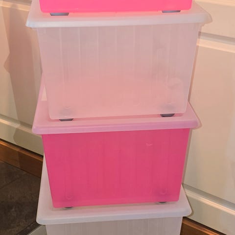 IKEA VESSLA er slitesterke plastkasser med hjul for oppbevaring