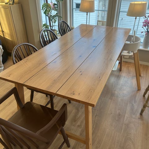 Nypusset og behandlet heltre Ikea spisebord. Flott og stødig bord. 220 cm langt med plass til 8 stk rundt bordet. Innser at bordet blir for stort for min leilighet.