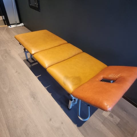 Solid massasjebenk i svensk kvalitet. Sammenleggbar og lett og få med seg. Innstilling av høyde. Hodestøtte og armlener. Stødig og god å ligge på. Flasser litt i skinnet, så trenger å bli smurt inn med skinnrens. Håper at denne benken kan gi glede og velvære til noen.