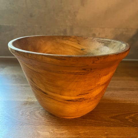 Skål skåret ut av tre. Vunnet på kunstlotteri i Asker for noen år siden. Skålen har synlige årringer og organisk form, med barkkant bevart på deler av kanten. Passer som serveringsskål eller dekorasjonsobjekt. Signert «Eple» på undersiden.