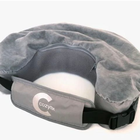Cozyfix ammepute i grå farge. Puten festes rundt livet med justerbar stropp og plastspenne for stabil støtte under amming. Myk overflate gir komfort for både barn og den som ammer. Egnet til bruk i stol, sofa eller seng der man ønsker ekstra støtte under amming.