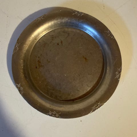 . Rund form med enkel profilert bunn og kant med mønster langs ytterkanten. Fatet har inngravert tekst på undersiden.