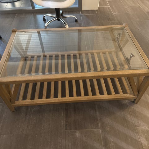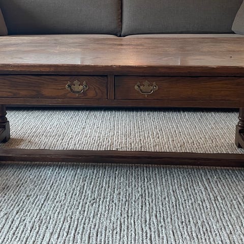 Salongbord i tre med rektangulær bordplate i mørkebrun finish. Bordet har dreide ben og en åpen hylle under bordplaten som gir ekstra oppbevaringsplass. I front er det en skuff som kan brukes til oppbevaring av mindre gjenstander. Passer som salongbord i stue eller oppholdsrom der det er behov for både bordflate og praktisk oppbevaring.