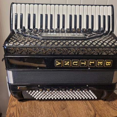 13 register diskant, 5 i bass, Vekt 11kg.
