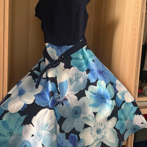 Vila bluse for dame i størrelse 38. Blusen er flerfarget med blomstrete mønster på mørk bunn. Den er laget i polyester og har lange ermer med mansjetter. Stoffet er lett og noe transparent. Passer til bruk både til hverdags og mer pyntede anledninger.