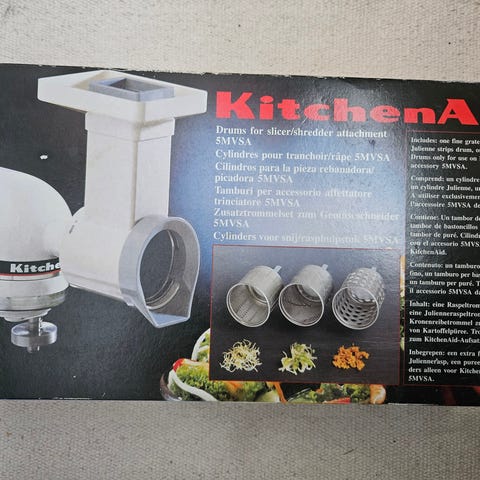 Pent brukt mandelkvern med tilleggsutstyr selges. Det følger med to tromler til for eksempel rasping eller skjæring av agurk, eple eller gulrot tillegg til trommel for kverning av nøtter. Den er intakt og i original emballasje.