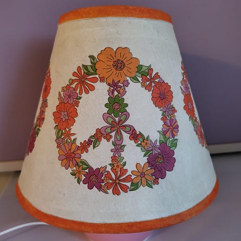 vintage lampeskjerm, retro lampeskjerm, blomsterform, blomsterskjerm, tekstil lampeskjerm, 70 tall, 80 tall, retro interiør, bohemsk, romantisk, nostalgisk, fargerik lampeskjerm, klassisk lampeskjerm, second hand, brukt interiør