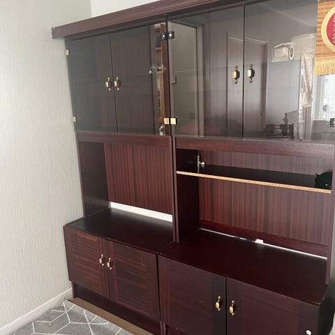 Vitrineskap med glassdører i treverk selges grunnet flytting.