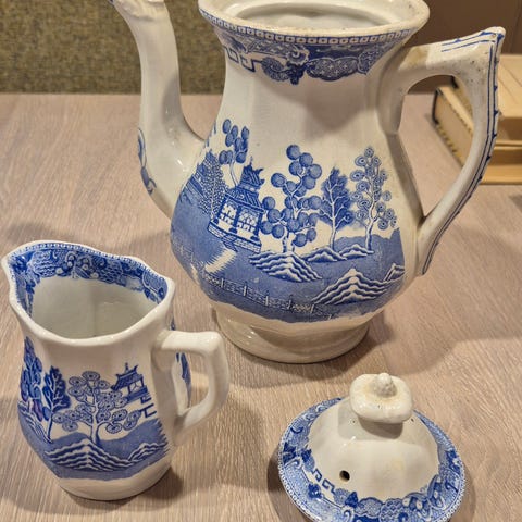Karaff og glass sett i fajanse med hvit basefarge og omfattende gullfarget dekor. Sett består av en stor karaff med hank og 4 drikkeglass i matchende design. Både karaff og glass har dekorative motiver i front, omgitt av detaljerte gullornamenter og rutemønster. Egnet som serveringssett til drikke eller som dekorativt innslag i kjøkken eller spisestue.