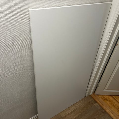 Pent brukt bordplate/ skrivebordsplate. Hvit høyglans. To av hjørnene er litt slitt. Lengde 150cm, bredde 75 cm. Tykkelse 3 cm. Skruehull til ben på baksiden.