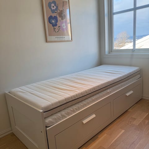 IKEA Brimnes med 2 skuffer/2 madrasser. Sengen kan trekkes ut til å bli en dobbeltseng 160x200 eller brukes som enkeltseng/dagseng.