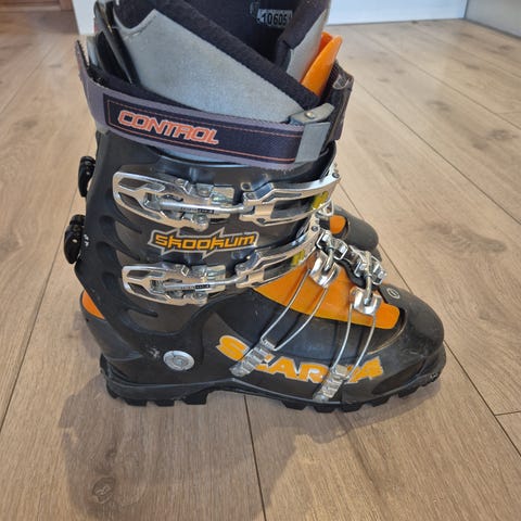 Scarpa Shookum toppturstøvler i svart og oransje. Støvlene har flere spenner for presis justering og god hæl- og ankelstøtte. Kraftig yttersåle med grovt mønster gir godt grep ved gange og anmarsj. Egnet for topptur og frikjøring med kompatible bindinger. Størrelse 43 og 322mm
