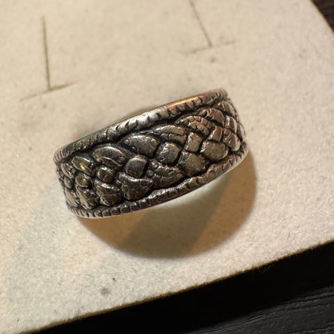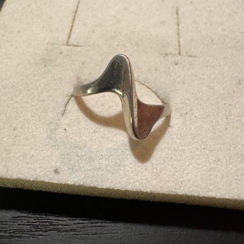 Ring for dame i sølv. Ringen har et asymmetrisk, bølgende design i front som gir et moderne uttrykk. Passer som hverdagsring eller som et enkelt smykke til penere anledninger.