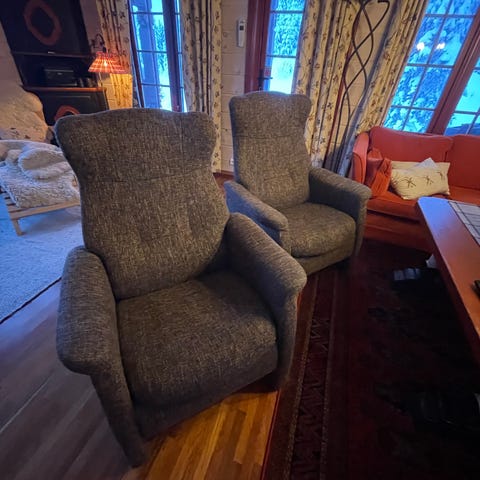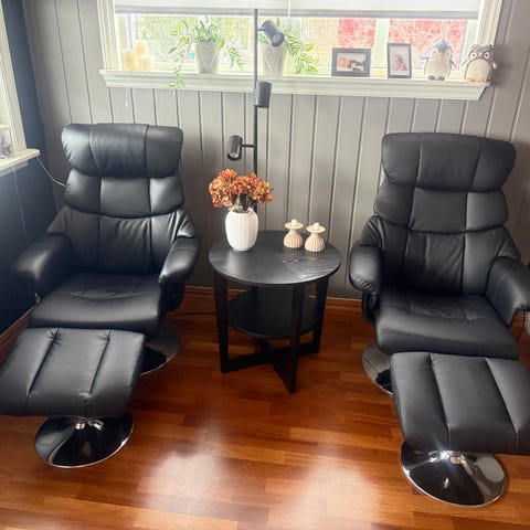 Hjellegjerde hvilestoler, den ene noe mer brukt enn den andre. Pris er samlet for begge. Sort skinn. Må hentes på Rjukan.