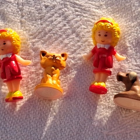 30 jente dukker, to hester og 2 gutter med masse tilbehør. Inneholder ulike antrekk og i ulike farger, samt diverse små møbler, vesker, kjøkkenutstyr, hårbørster, flasker og andre småting til lek. I tillegg følger det med plastdeler til en lekeinstallasjon eller bane i sterke farger. Delene er i hovedsak laget av plast i ulike farger.
