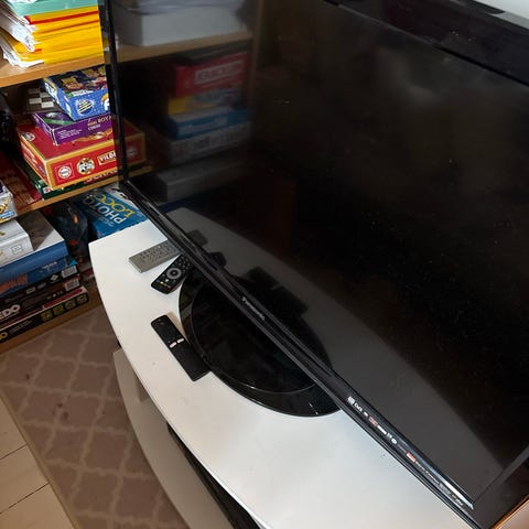 Philips TV i svart utførelse. Flat skjerm med bordstativ, egnet for plassering på TV-benk eller lignende. Passer til vanlig TV-bruk og tilkobling av eksterne enheter via tilgjengelige innganger på baksiden eller siden av TV-en, avhengig av modell. Tipper den er 46’