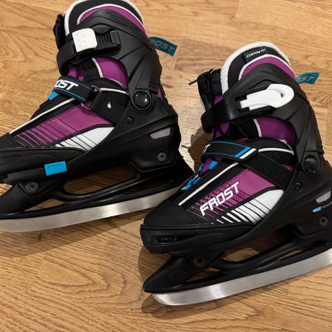 Ishockeyskøyter for barn i størrelse 31. Skøytene har overdel i syntetisk materiale i svart og grått med hvite detaljer. Blad i metall med plastkappe rundt hæl og såle. Snøring foran for justering og god støtte rundt ankel. Egnet til ishockey og generell bruk på is for barn med skostørrelse 31.
