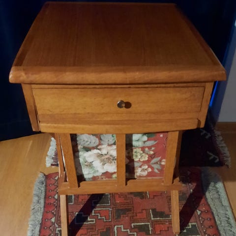Selger et vakkert antikt bord i heltre eik. Kan brukes både som pynt, som sminkebord, eller entremøbel. Møbelet har en flott platina og originale utskjæringer. Hylle oppå er løs. Det følger med 2 nøkler. Må hentes i Drøbak, etter avtale 16-19.februar. Kun vipps.