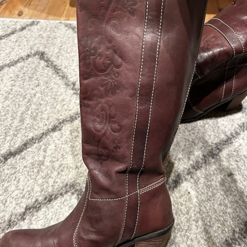 Cognac brun farge. Mener disse er i skinn men finner ikke noe symbol på det så er ikke 100% sikker. De er noen år gamle og brukt, men mye sko igjen.