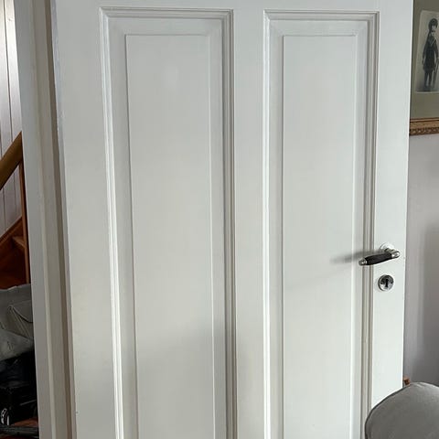 Innerdør med fire glassfelt i overdelen. Døren er malt hvit og har dørhåndtak i messing. Passer som innvendig dør mellom rom der man ønsker lysgjennomgang, for eksempel mellom gang, stue eller veranda. Døren er over 100 år. Høyde: 216 cm og bredde: 97 cm. Døren selges uten karm.