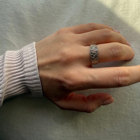 Marihøne ring for barn i sølv. Ringen har et hjerteformet design rundt marihønen og er merket 835 på innsiden av ringen. Passer som hverdagsring eller til enklere pynting. Størrelse fremgår delvis av bildet med målebånd; eksakt ringstørrelse bør eventuelt måles av kjøper.
