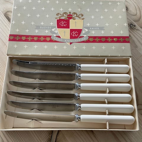 Vintage sett med 6 smørkniver/dessertkniver med pastellfargede skaft fra Geilo Jernvarefabrikk. Serien heter "Märtha", merket med "rustfri" på bladet. Fremstår som nye. 17 cm lange.