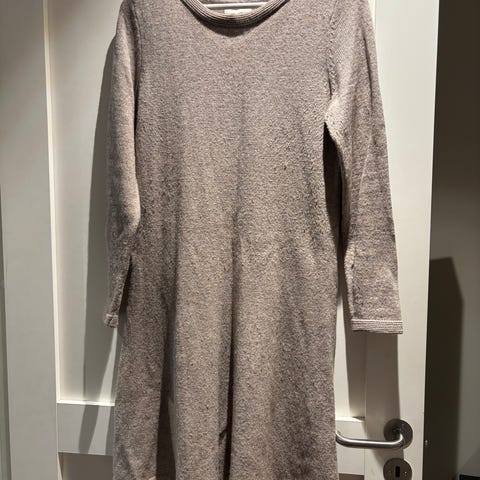 Kjempefin flettestrikket kjole i ull (40% ull og 7 alpakkaull). Størrelse XS', men jeg synes det er litt stor i størrelsen og passer bedre en S. Fargen er noe midt i mellom lys beige, offwhite og natur.