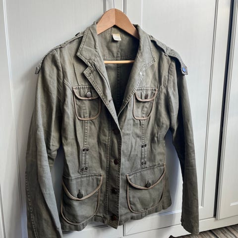 Bomulls jakke for vår og sommer , str.L. men er som en str.M. Militær grønn jakke med heklet kanter og med fint feminint snitt. Ved knappene er det kroker for å lukkes. Brukt bare noen få ganger, den skal være litt ujevn i fargen.