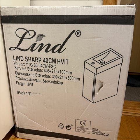 Kjøpt nytt i 2009. Baderomsskapet ligger uåpnet i eskene da vi valgte å ikke montere det på vårt den gang nye bad. Etterpå har det blitt liggende.