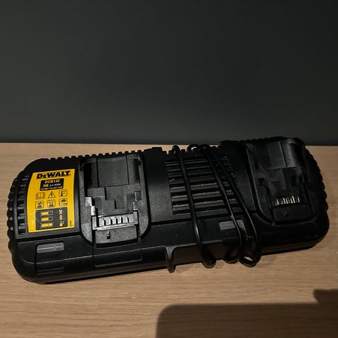 DeWalt DCB132 batterilader for oppladbare verktøybatterier. Modellen er en dobbel lader med to ladeporter, beregnet for DeWalt XR 18V og FlexVolt 54V batterier (Li-ion). Inngangsspenning er 230V, 50Hz, 1,5A. Utgang per port er 4A, 22V. Laderen har nettkabel med støpsel for vanlig stikkontakt og ventilasjonsåpninger for kjøling. Egnet til lading av kompatible DeWalt-batterier til elektroverktøy og tilbehør.
