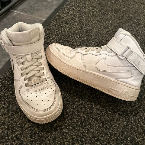 Nike Air Force 1 joggesko i størrelse 38. Modellen er i helhvit farge med snøring og perforert tåparti for ventilasjon. Overdel i syntetisk materiale og gummisåle med karakteristisk Air Force 1-sålekant. Passer som fritidssko og hverdagsbruk.