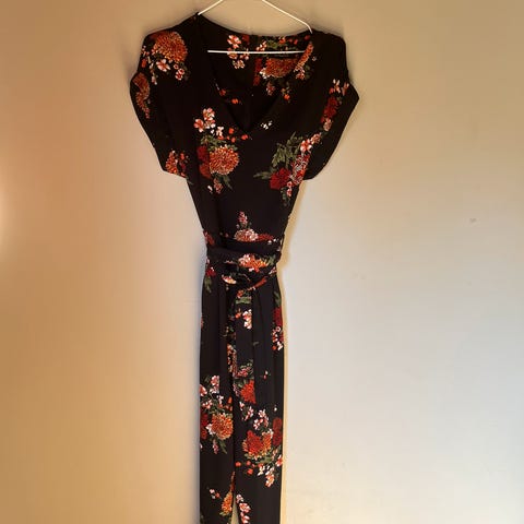 Kjempekul jumpsuit i flerfarget blomstermønster. Størrelse 44/46, men den er veldig strechy og romslig med strikk (ikke stram) i livet.
