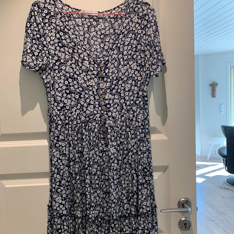 byTiMo sommerkjole i størrelse S for dame. Kjolen er svart med blomsterprint og er laget i 100 % viskose, både ytterstoff og fôr.