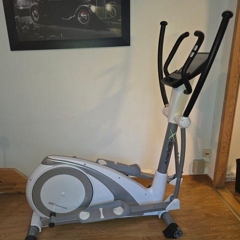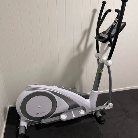 Ustyle ellipsemaskin i grå utførelse. Maskinen har håndtak for overkroppstrening og fotplater for jevn bevegelse. Konsoll med enkel skjerm for visning av treningsdata som tid, distanse og antall steg (funksjoner kan variere). Motstanden justeres manuelt med dreiehjul under konsollen. Egnet til innendørs kondisjons- og mosjonstrening for én person om gangen.