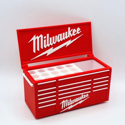 Verktøykasse med lokk og seks uttrekkbare skuffer i metall. Kassen har bærehåndtak på sidene og lås i front med nøkkel.