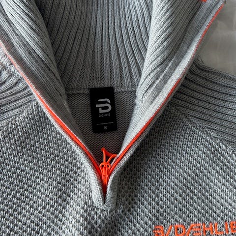 Genseren er grå og laget i ull, med halv glidelås i halsen og raglanermer.